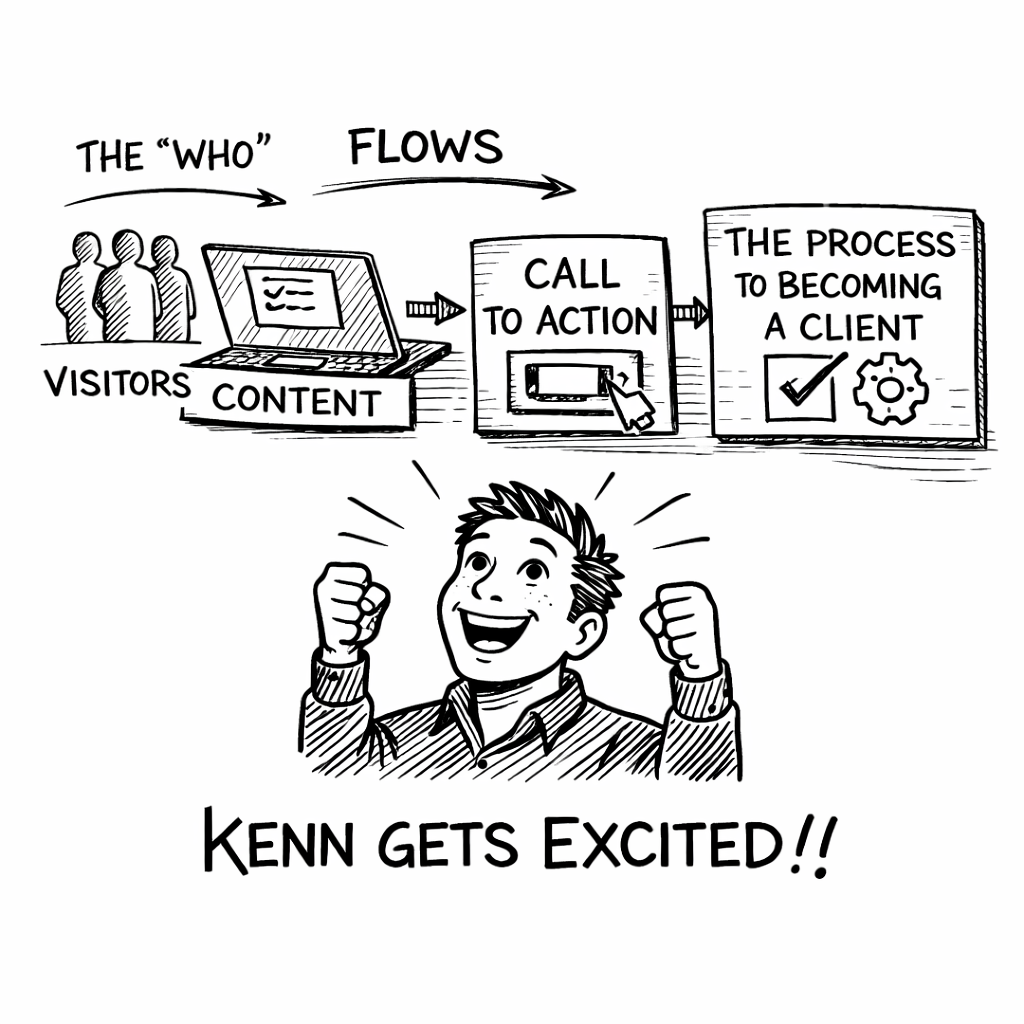 In the bigger picture, if the website is getting VISITORS who fit the WHO and the content FLOWS (with credibility, and value) to a CALL-TO-ACTION that invites people into a PROCESS (sales, follow-up, enrollment, pick your word for this) to become a client, then Kenn gets excited ;D