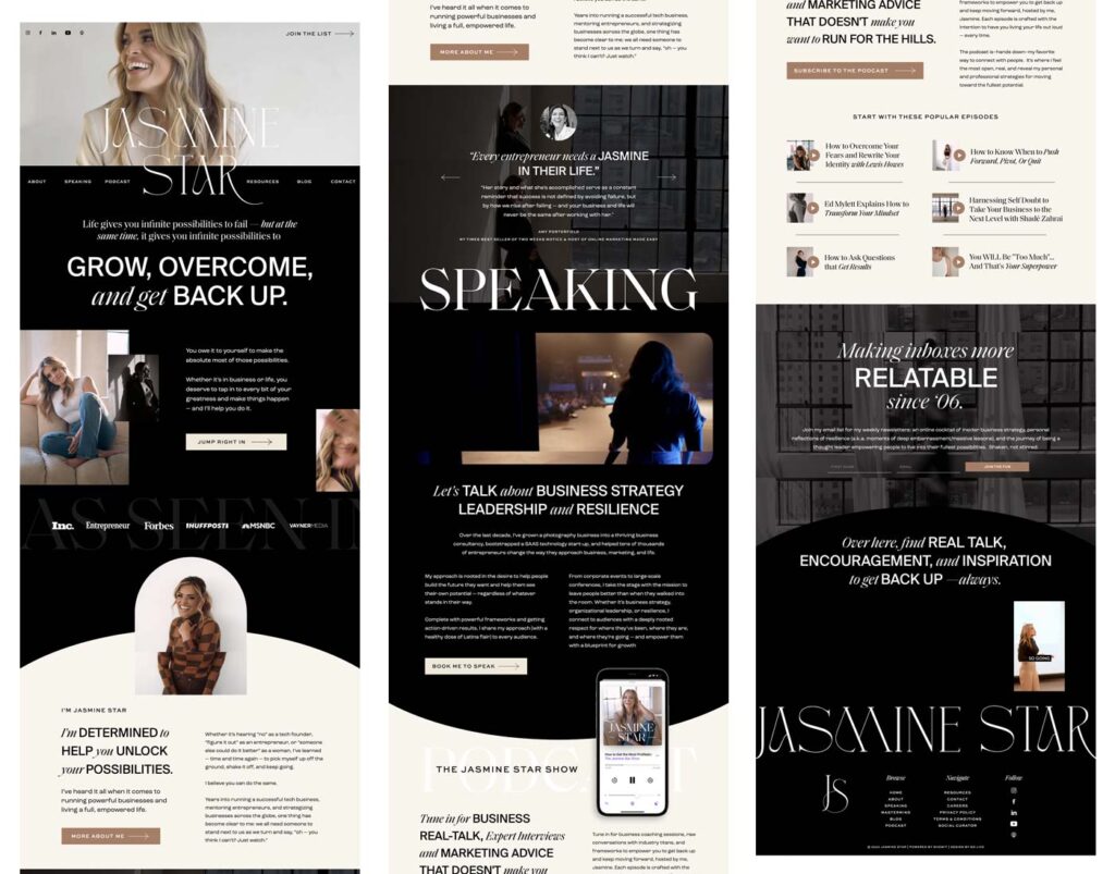 Jasmine Star’s site channels the Sage and Hero archetypes—showcasing expert guidance, resilience, and motivational energy through strategic clarity, personal storytelling, and bold, empowering design.